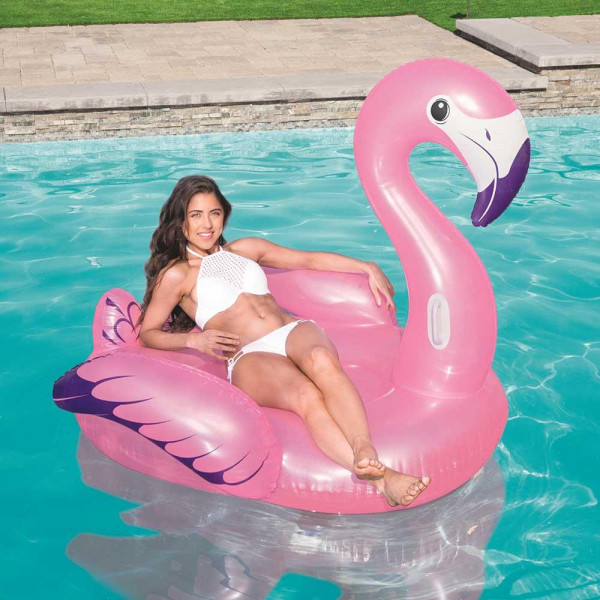 A boia divertida flamingo luxo da Bestway é um modelo inflável para piscina, mar e rio, indicada para adultos. Totalmente rosa, ela possui pequenos detalhes em azul.