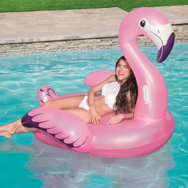 A boia divertida flamingo luxo da Bestway é um modelo inflável para piscina, mar e rio, indicada para adultos. Totalmente rosa, ela possui pequenos detalhes em azul.