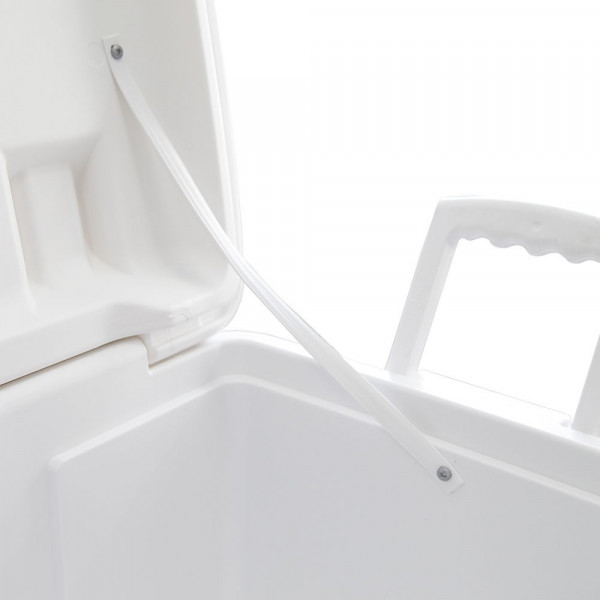 A alça da caixa possui três regiões de pegada para facilitar o seu transporte com uma mão só. O cooler ainda possui alças modeladas nas suas laterais, visando auxiliar o seu carregamento/descarregamento de veículos.