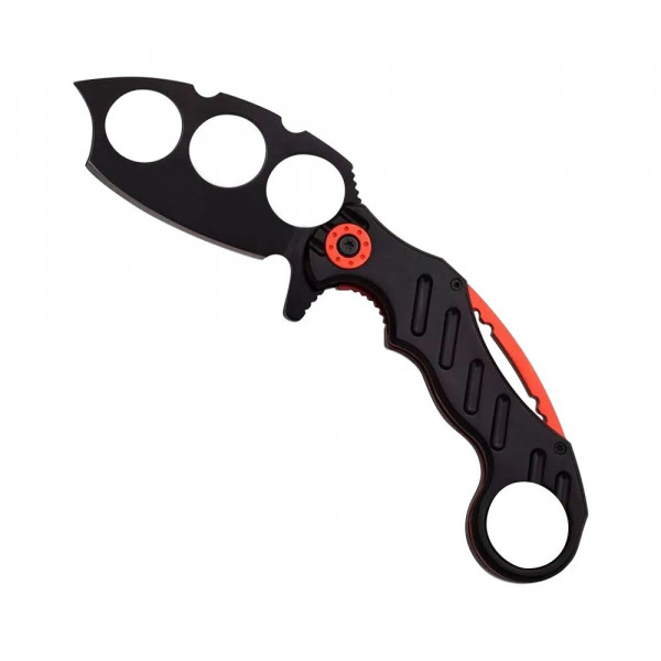 É fabricado em Aço Inoxidável preto, extremamente resistente. A empunhadura é fabricada em alumínio preto com detalhes em vermelho, com um lindo acabamento e um design inovador, é ideal para colecionadores de canivetes.