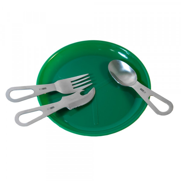 O Kit Azteq Jamboree acompanha 1 colher, 1 garfo, 1 faca com abridor de lata, mini-mosquetão e bolsa de transporte. Material resistente feito em aço inoxidável para ser usado em qualquer tipo de alimento.