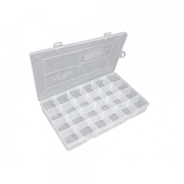 Estojo em material resistente para armazenar iscas, que permite a criação de até 24 repartições.
