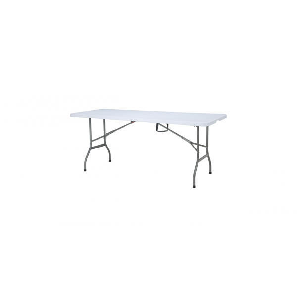 A mesa é fabricada em polietileno de alta densidade, garantindo resistência e durabilidade superiores. A presença de uma trava de segurança garante a estabilidade do tampo, enquanto os pés contam com um acabamento emborrachado anti-deslize, proporcionando estabilidade mesmo em terrenos irregulares.