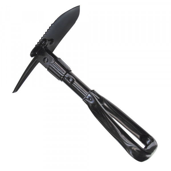 De um lado, temos uma pá, com uma das laterais serrilhada e a outra liso. Do outro, temos uma picareta, sendo todo o corpo do produto feito em aço revestido com pintura antioxidante.